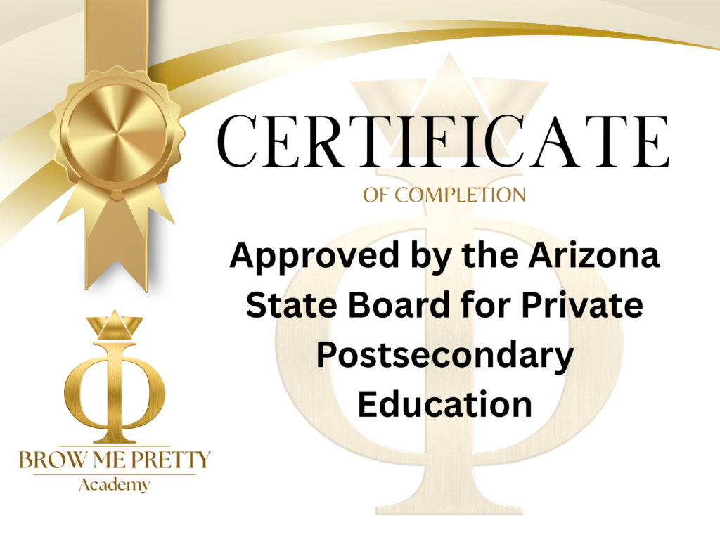 You do need to be trained by a school that is licensed by the Arizona State Board for Private Postsecondary Education if you want a legitimate, recognized certification. Brow Me Pretty Academy is Arizona’s only state-licensed specialty school dedicated exclusively to brow permanent makeup education, focusing on professional brow PMU techniques while providing structured, licensure-ready training that aligns with regulatory standards. Completion of this program, along with Bloodborne Pathogen certification, prepares graduates to be eligible for licensing in states that regulate permanent makeup, and when Arizona implements them in the near future.